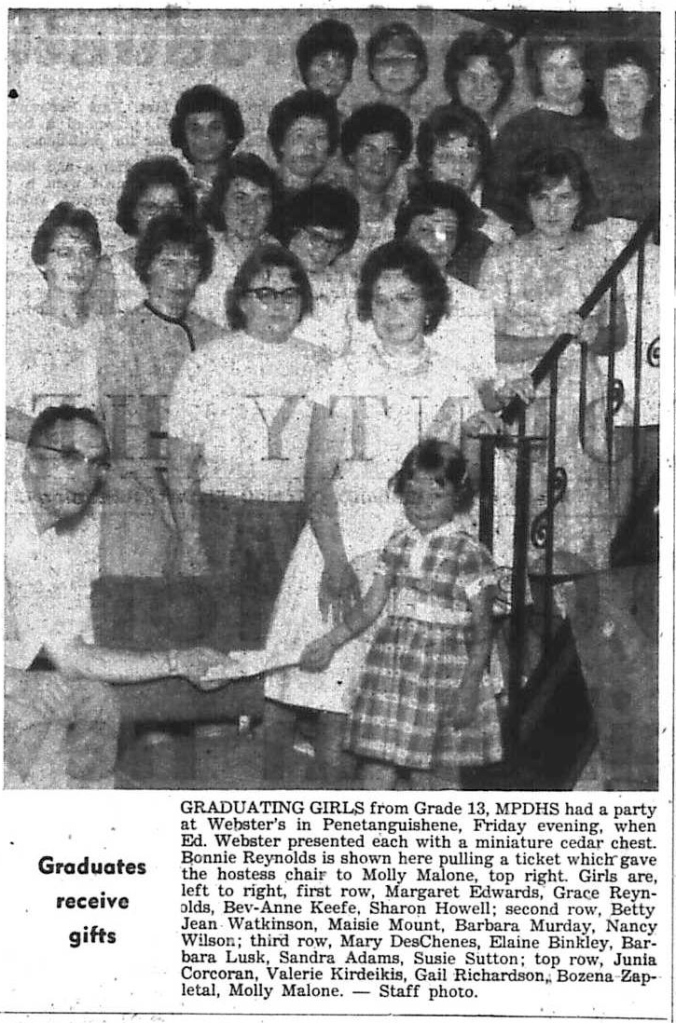 More than 150 parents and friends saw a class of 45 Grade 8 students graduate from Parkview Public School, Wednesday. Students filed to the centre of the stage and received their diplomas from Harold Wilcox, public school board member, assisted by J. B. Yelland, vice-principal. Before the ceremony incoming Home and School Association President, Mrs. L. M. Joiner introduced guest speaker R. C. Gauthier, principal Midland – Penetanguishene District High School. In answer to his question as to how many students intended to graduate from Grade 13, Mr. Gauthier noted a showing of more than 40 hands. However, he pointed out, “Only eight of you will get past Grade 12 and only three will graduate from Grade 13. Why is there so much difference between your intentions and the results?” he asked. Mr. Gauthier cited “conformity” as one reason. Most of us like to conform to the 95% who don’t get there,” he said. “Such people,” he stated, “are like a ship without a crew. They have no goal. Every day repeat to yourself what you want to be,” he advised. Bud Laity entertained with two solos, Tommy Lad and Daddy’s Little Girl. He was accompanied on the piano by Kathy McElroy.