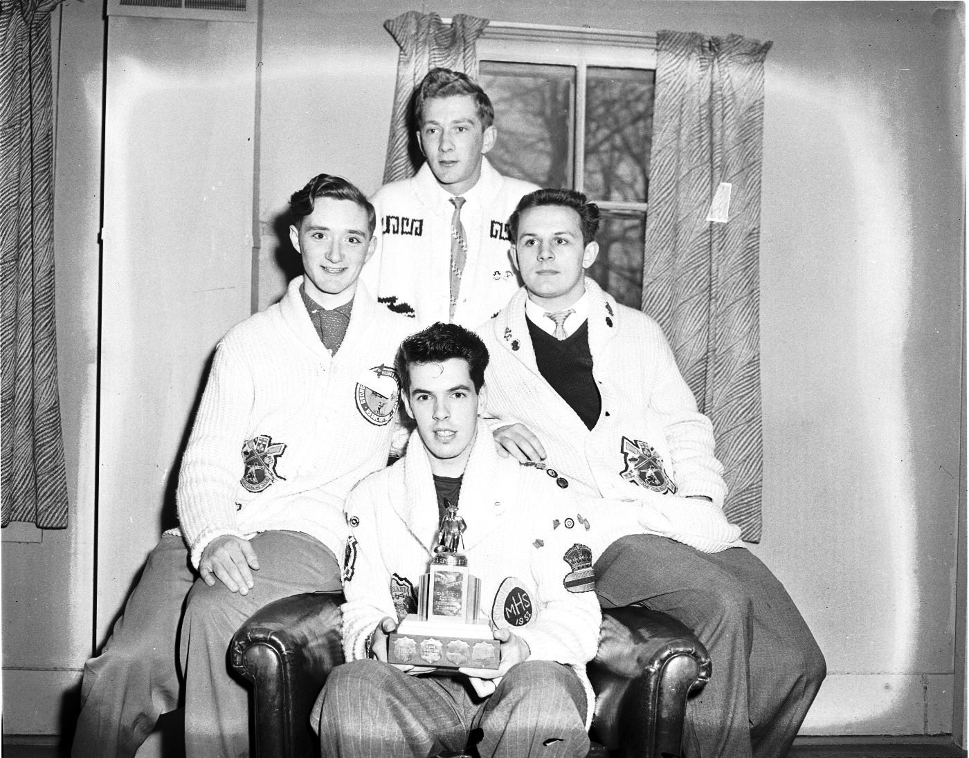 Quartet from MPDHS won the invitational section of the school boy bonspiel in Owen Sound last week. Skip John Scott holding the trophy, Ross Hastings, Ken Gauthier and Peter Moreau.