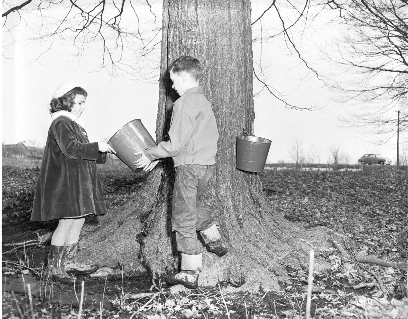Gudrun Mandler, 8, and Siegrid Mandler, 9, enjoy the fresh maple syrup, the siblings recently arrived from Germany with their parents who work at the Leitz plant in Midland.